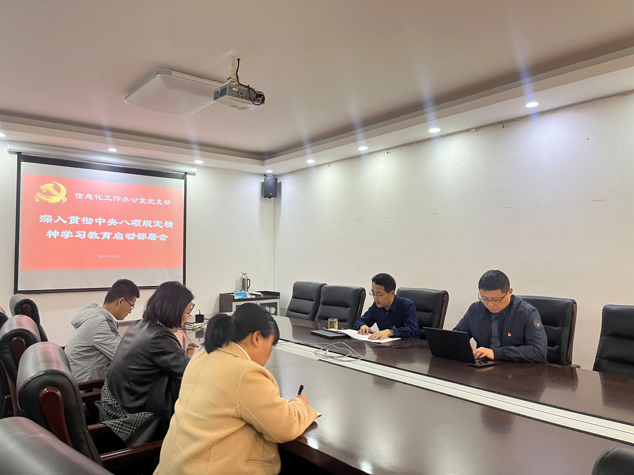 3月24日下午,信息化工作办公室党支部组织召开深入贯彻中央八项规定精神学习教育启动部署会,传达学习《机关党委深入贯彻中央八项规定精神学习教育工作方案》精神,安排部署贯彻落实工作。会议由信息化工作办公室党支部书记王宗军主持,部门全体党员参加。