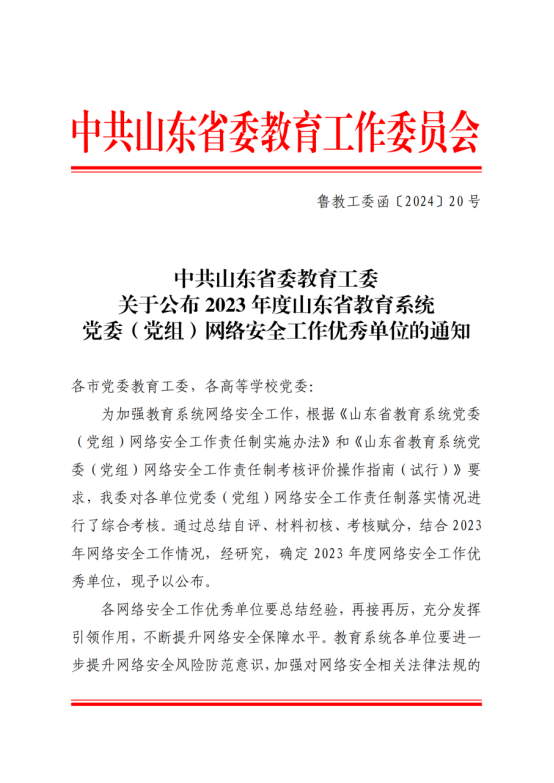3月10日,中共山东省委教育工委发布了《关于公布2023年度山东省教育系统党委(党组)网络安全工作优秀单位的通知》(鲁教工委函〔2024〕20号),通报表彰2023年度山东省教育系统党委(党组)网络安全工作优秀单位,我校已连续四年荣获网络安全工作优秀单位称号。