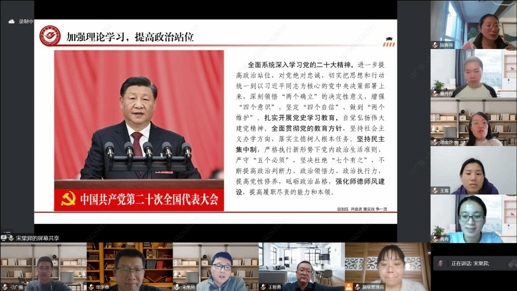 最后,他要求部门全体同志认真学习贯彻党的二十大精神,党员同志们要起到带头和表率作用。他要求:一是做到政治理论学习常态化,脚踏实地落实各项中心工作,创新工作理念,形成工作合力。二是思想上保持清醒意识、危机意识,遵纪守规,规范自身行为,转变工作作风,提升个人工作能力。三是要守正创新,适应新形势变化,为即将开展的智慧教育示范校建设、教育数字化转型和学校的申硕、应用型本科建设等做好充分的思想准备、行动准备。以“东方欲晓,莫道君行早”的状态,“踏遍青山人未老”的韧劲,继续发挥信息化的驱动力,推动学校事业高质量发展。