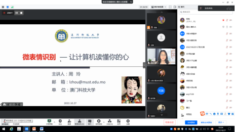 周玲老师从宏表情与微表情对比、微表情在实际情况中的应用为大家介绍微表情分析的当前发展现状,通过丰富的图画和数据分析讲解了目前研究课题的内容,使大家对讲座内容了解更加深入清晰。