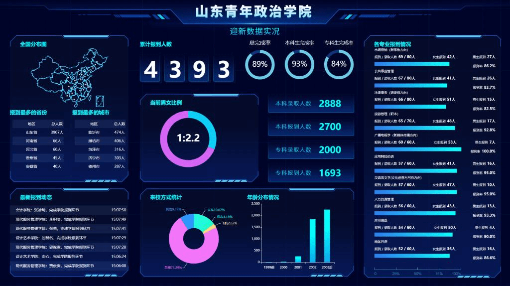 智慧迎新系统采用一体化设计理念,新生报到过程的每一个环节都可以实时办理和统计,每个环节的报到情况都得到清晰的展现,能够及时掌握报到进度。系统支持丰富的图形化数据展示模型,数据支持下钻到字段,通过系统可以实时了解报到人数、新生生源地、性别、身高、民族等各类信息。