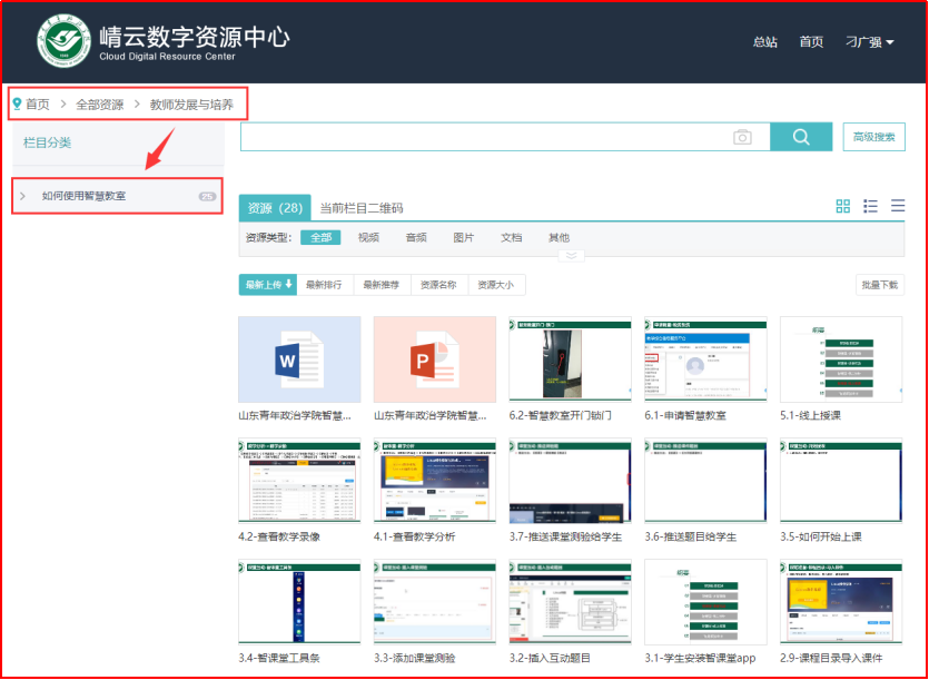 智慧教室使用微视频课程已上传至学校数字资源云服务平台,教师可通过学校智慧校园融合门户平台进行访问。访问路径如下:智慧校园融合门户->应用中心->教学科研->数字资源云服务平台->站点->崝云数字资源中心->教师发展与培养->如何使用智慧教室。