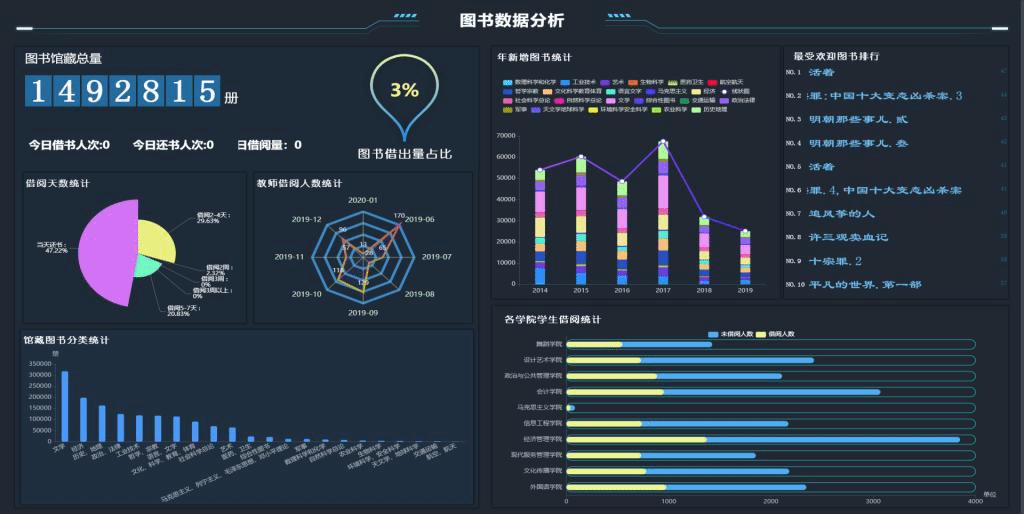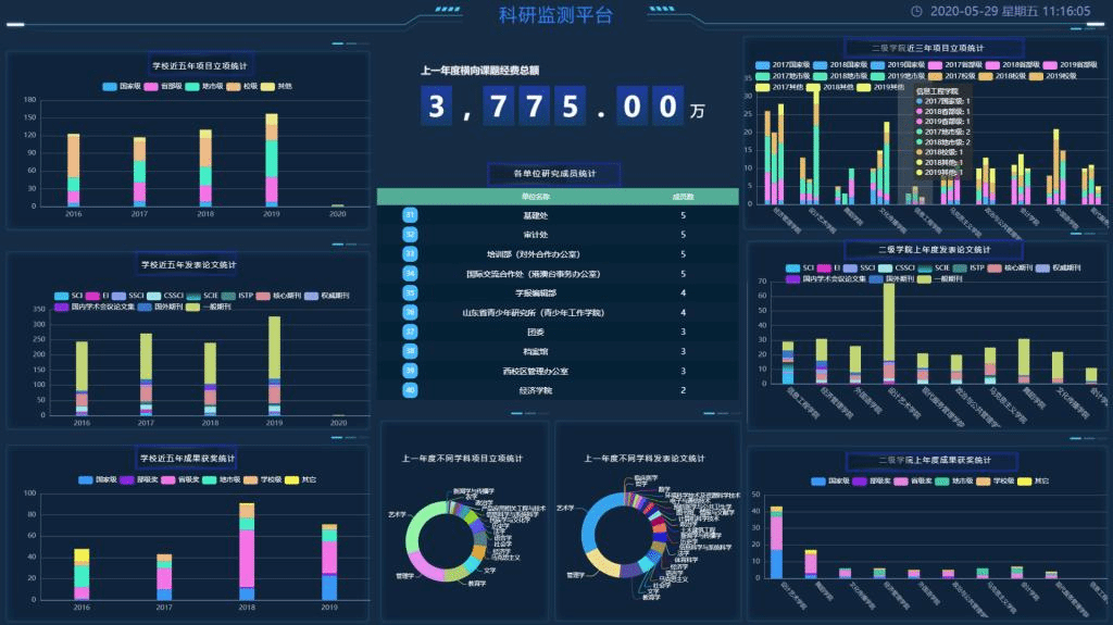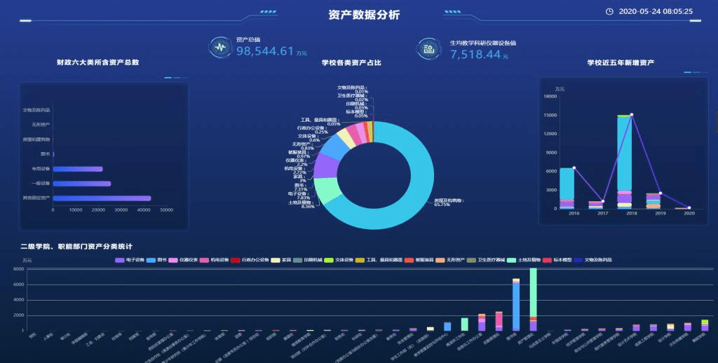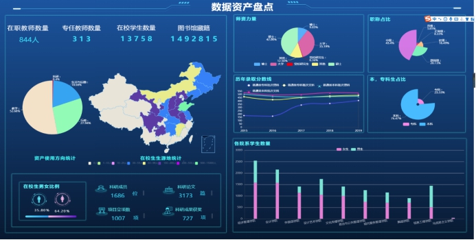 为更好地支持学校各项业务管理决策、服务高质量发展,信息化工作办公室会同华为公司基于公有云平台开发了智慧崝云-数据资产可视化大屏(DLV),提供数据资产可视化应用服务。该系统以图形化方式展现学校总体运行状态,学校、二级学院以及教职工的科研成果,资产配置,校园消费,图书馆运行以及图书借阅等情况。