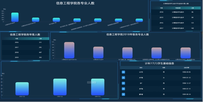 【各院系学生数量】柱状图支持通过鼠标点击各学院下钻到学院各专业学生数量、各年级学生数量、各班级学生数量、班级成员列表、学生个人信息。 |