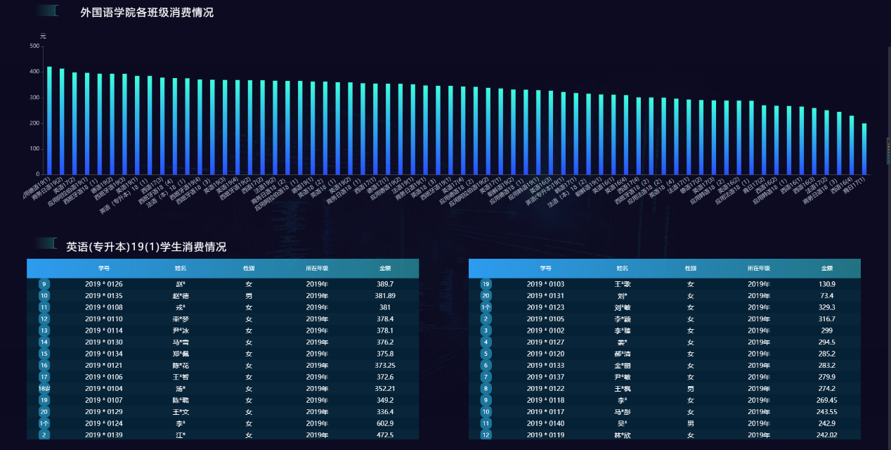 【当月各学院学生餐饮人均消费】支持通过鼠标点击下钻到各班级人均消费,并进一步下钻到学生个人消费数据。 |
