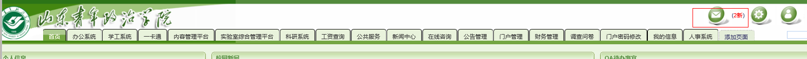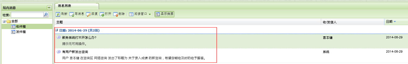 学校信息门户“站内消息”(如:图1),在收件箱的信息列表中,存在两条“教务系统打不开怎么办”和“用户新发出咨询”站内消息(如:图2)。