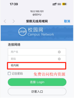 在校内教学和办公区域建设的专用网络(教科研网)由学校信息化工作办公室运营和管理,SSID:@SDYU(建议首选使用),用户名为学号/工号,初始密码为智慧校园密码,备用SSID:SDYU-2.4G或SDYU-5.8G,用户名为学号/工号,初始密码为身份证号码后8位,登陆时选择服务类型为“校内网”,可以免费使用校园网访问学校内部资源,包括:教务系统(选课、查课表、查成绩等)、图书馆电子资源、网络教学平台、在线课程平台等。
