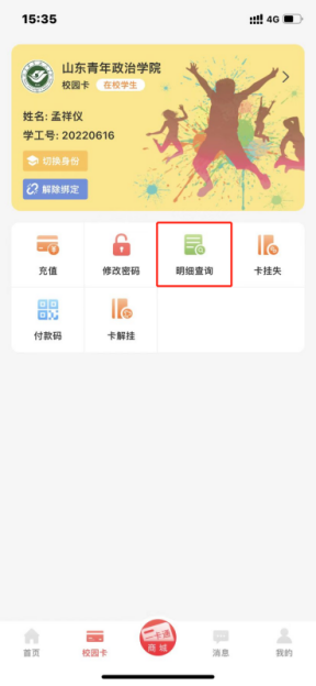 点击校园卡界面“明细查询”,可查看校园卡充值和消费记录。