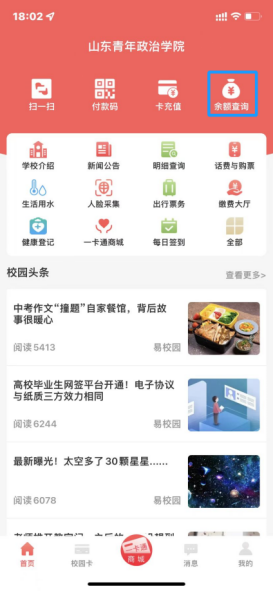 在易校园APP首页点击余额查询即可查询到卡内现有余额。