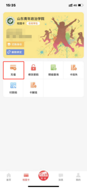 易校园APP内,点击校园卡,在此页面可以进行充值。