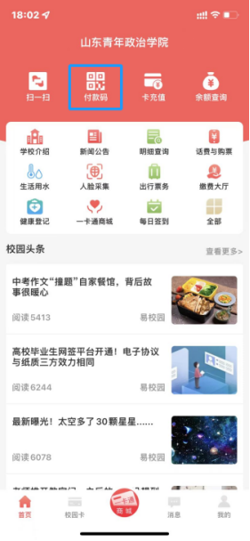 进入易校园APP,点击付款码,输入交易密码(默认密码为身份证号后六位),出示二维码即可。