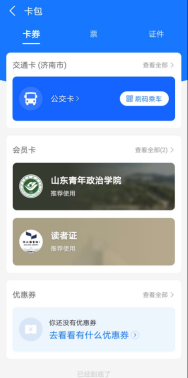 第三步:进入“支付宝”APP的卡包,找到“山东青年政治学院”的卡片,点击进入。