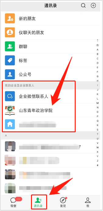 4.关注微信企业号。使用微信“扫一扫”扫描山东青年政治学院微信企业号二维码,完成“关注”,通过微信—通讯录—我的企业,访问“山东青年政治学院”。